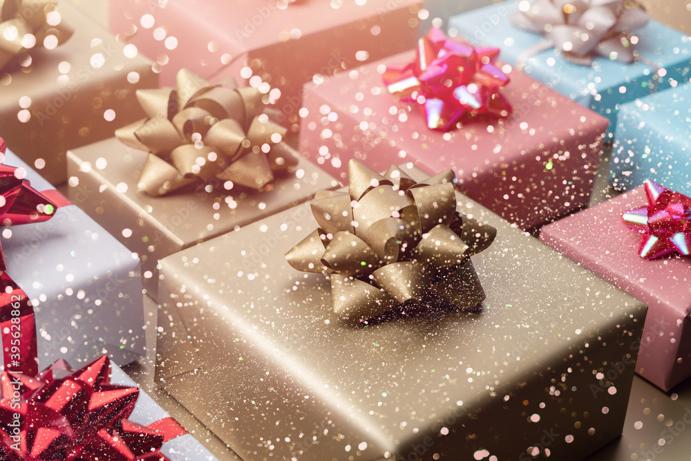 Colorful holiday gift boxes with bows on gold backgound. Merry Christmas, New Year, Happy Birthday, Valentines day card. Flat lay, top view
