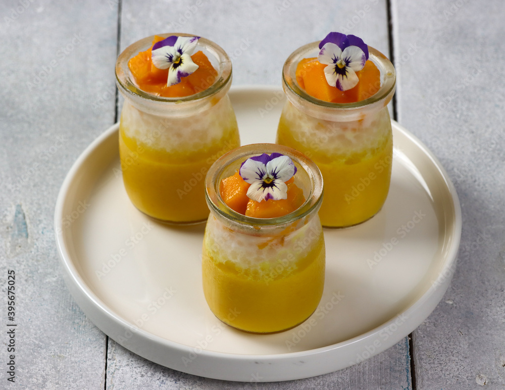 Royalty-free stock photo ID: 1785693371 Mango sago. Healthy tapioca pearls pudding dessert with coconut milk and mango garnish with edible flower.