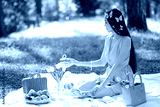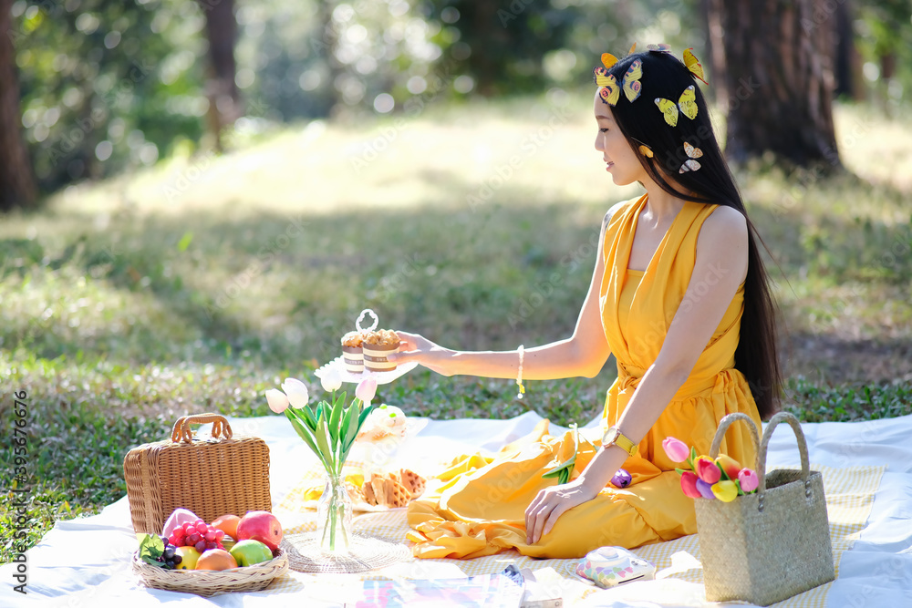 Portrait of happy young woman picnic in the park and relaxing on holiday