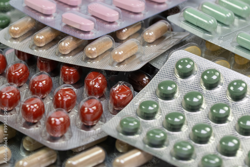 Viele bunte Tabletten, Medikamente in einer Nahaufnahme