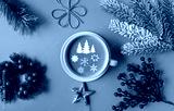 Cup of coffee with milk and christmas decorations on blue background, copy space for text,flat lay.