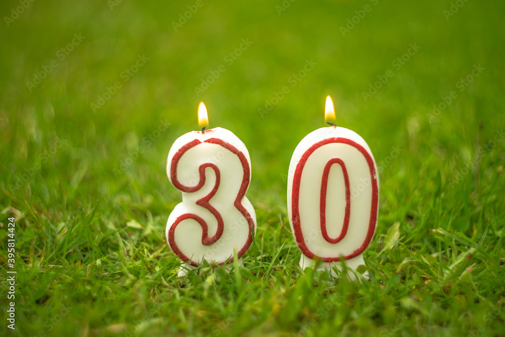 Lit candles in the form of numbers 30 on a green background for the birthday