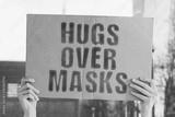 The phrase " Hugs over masks " on a banner in men's hand with blurred background. Pandemic. Epidemic. Freedom. Virus. Disease. Sickness. Hospital. Infectious. Contagious