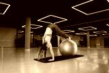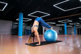 Young woman doing pilates exercises on fitness ball in a modern gym. Swiss ball.