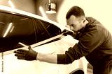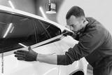 Auto body repair series. Masking car before repaint. Man in a black uniform.