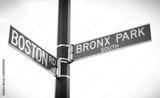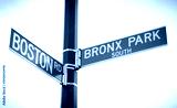 New York City Green Street Signs. Boston Road and Bronx Park South intersection. Low Angle View, Cloudy Sky in background. Manhattan, New York, USA.