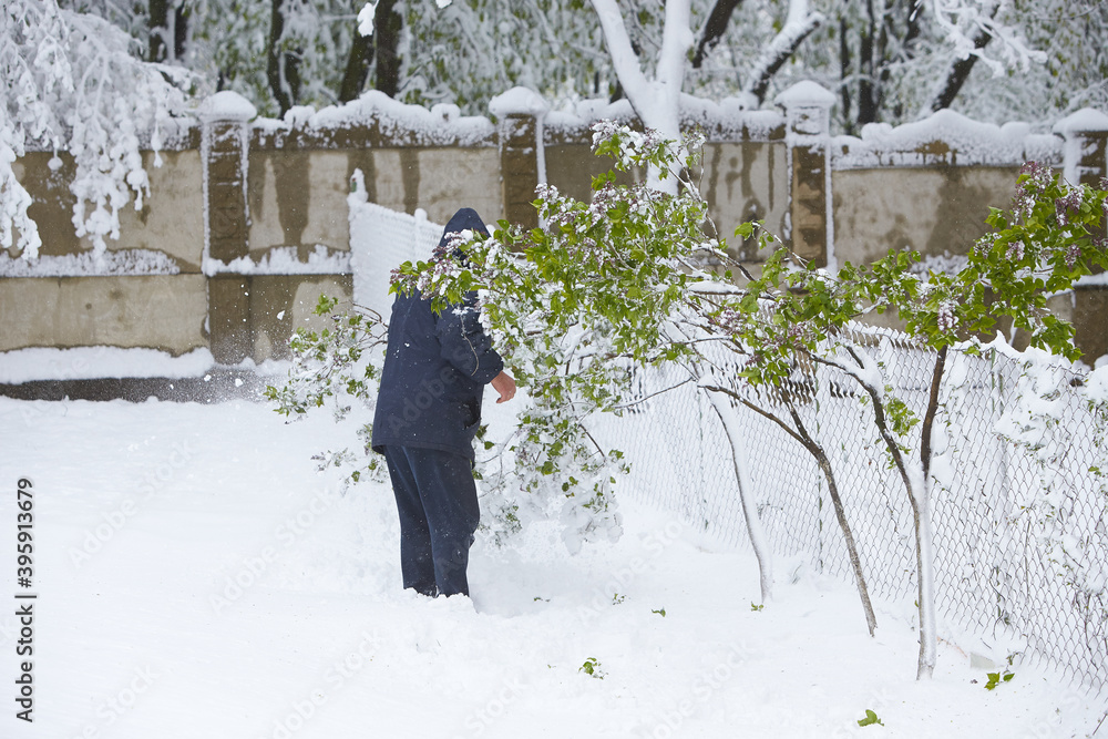 A man shook snow from a lilac bush. Spring blossom trees under the snow. Branches with green leaves under the snow. Spring cataclysm