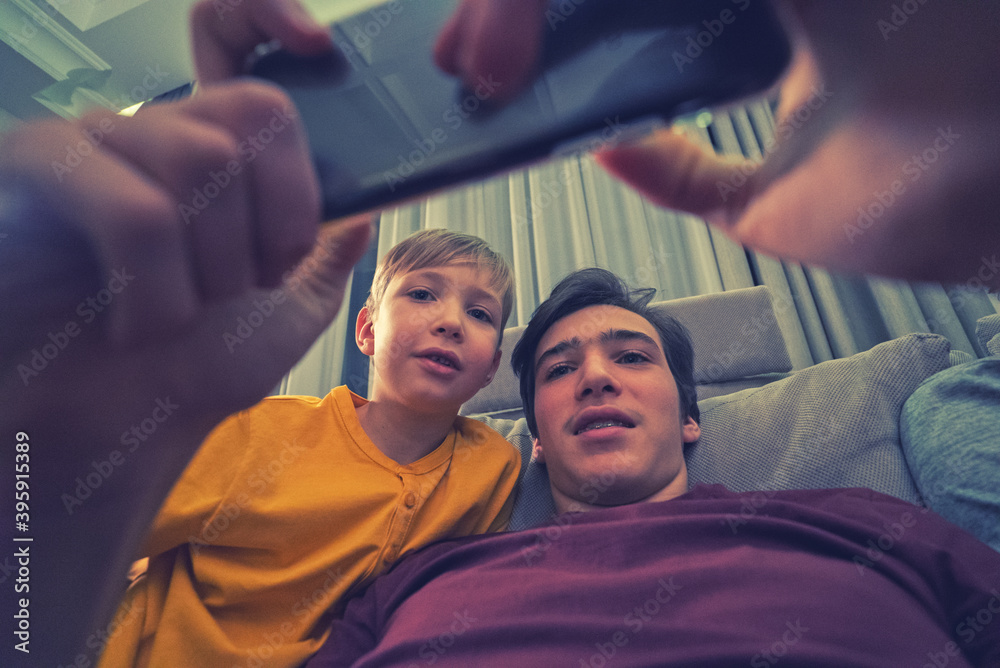 Happy boys spending time in a social network using mobile phones. Children with smartphones at home. White kids using cell phones for gaming. People and social media concept