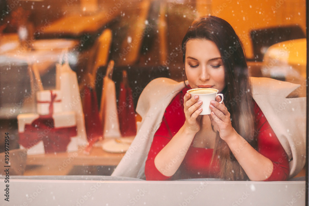 Portrait beautiful cheerful girl in stylish coat drink coffee in mall cafeteria. Happy young attractive elegant woman enjoy cappuccino coffee in restaurant. Coffee break, winter holidays shopping