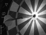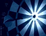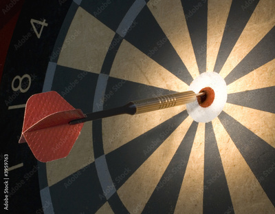 Bullseye on a dark dartboard with a big red dart