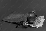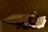 Geldscheine, Weihnachtsgeld im Jutebeutel vor rotem Hintergrund