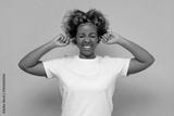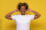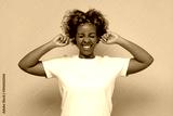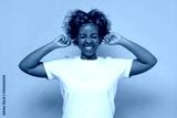 African young woman with curly hair plugging ears.