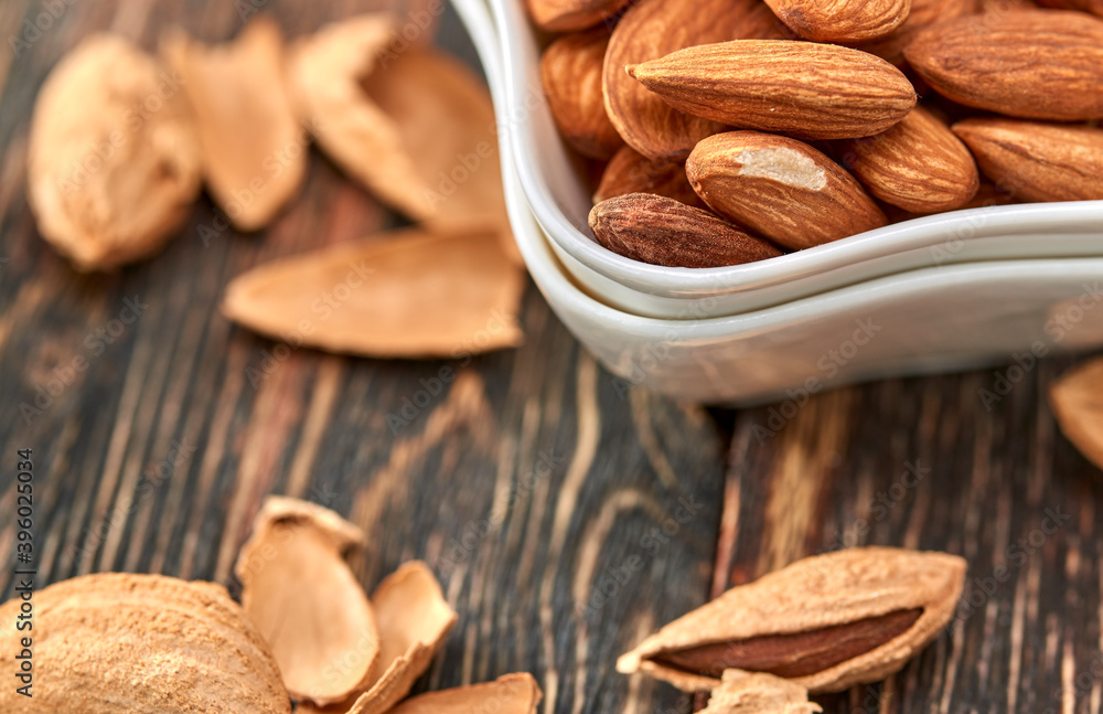 Almonds almond kernels lie on a dark tree.