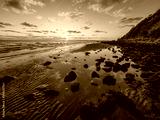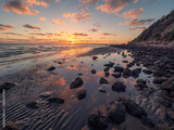 Beautiful Seaside Sunrise with Cloud Reflections and Rocks