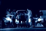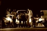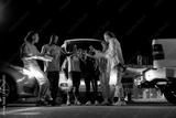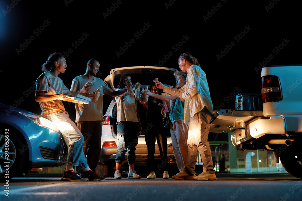 Young casually dressed friends of different nationalities standing in front of each other outside on a parking site clinking bottles of beer while eating pizza