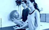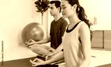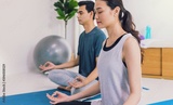 Asian young couple exercise and play yoga together at home background.Concept of Exercise during the quarantine at home for preventing coronavirus and covid-19 infection.