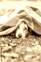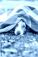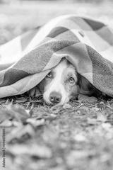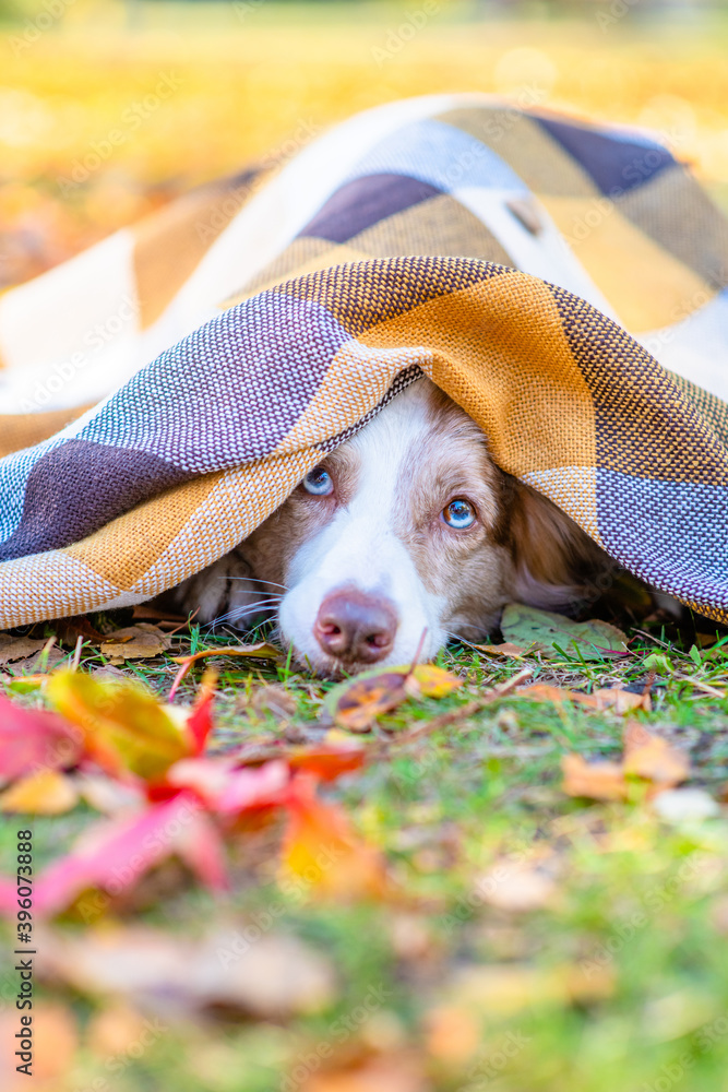 Frozen Border collie dog lies under a warm plaid in an autumn park
