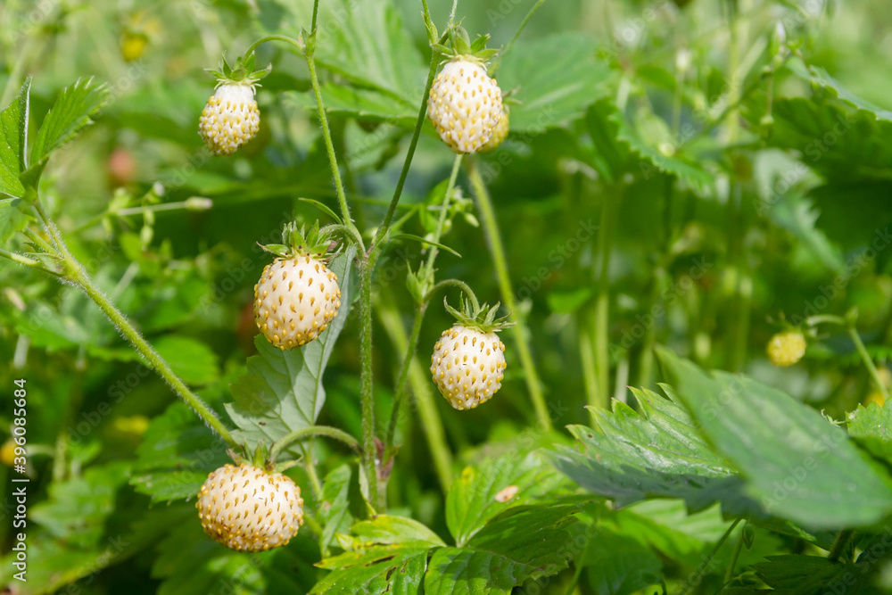 White fragrant strawberries grow on the Bush. Strawberries grow in summer on a plant in the forest in nature.
