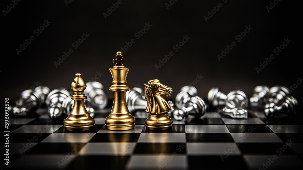 King queen and knight chess team standing on chess board with chess that fell in the back concepts of business team and leadership strategy and organization management.