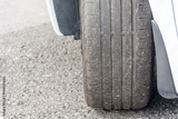 Badly worn out car tire tread and damaged bulb like side due to wear and tear or because of poor tracking or alignment of the wheels, dangerous for driving, unsafe, not safe for use, copy space.