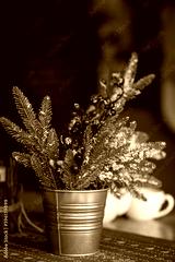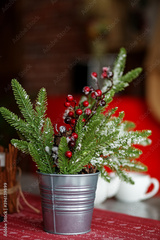 Decorative Christmas tree with red berries in the interior in an iron decorative pot