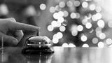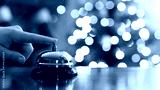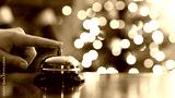 Christmas travel. Hand of guest ringing bell on reception desk of guesthouse and color shining garland on christmas tree on background. Hotel, restaurant.