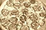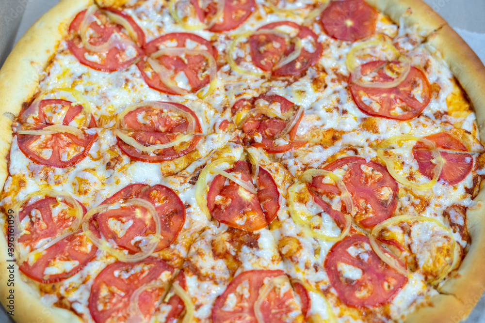 Pizza with tomatoes, onion, cheese and sausage. Fresh and fast food background close up.