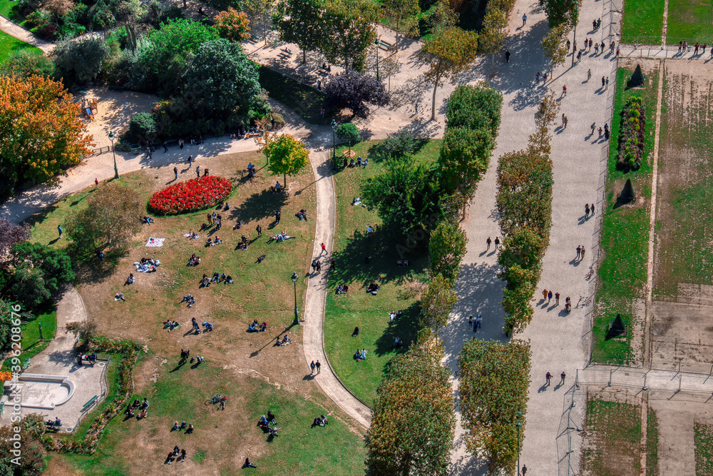 Gardens near the Eiffel tower seen from above, in Paris, France
