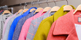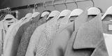 Several wool coats hanging on a hanger in the store. New collection of wool coats, autumn clothes for cold weather.