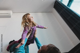 happy cute little girl flying in fathers arms in bedroom, single dad lifting cute little daughter