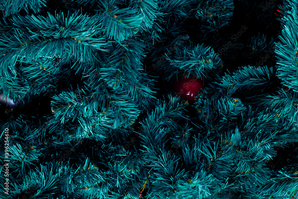Christmas tree and ball background, closeup nature view of green leaf
