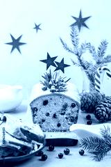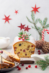 Festive christmas fruit cake with cranberries, raisins and almonds, decorated with fresh cranberries and rosemary on white table and background. Christmas decoration with stars. Vertical image.