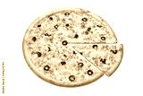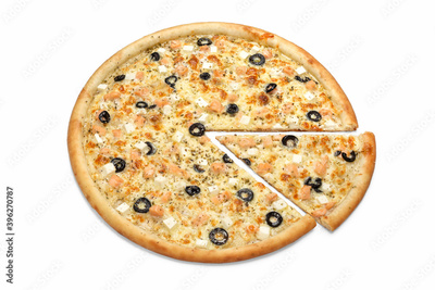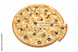 Italian pizza with seafood and olives, concept for flyer, poster, pizzeria menu. Slice of pizza, copy space, isolated.