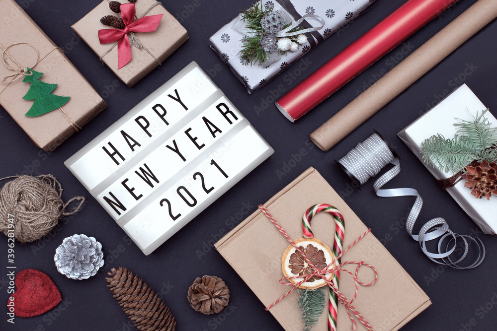 Christmas background, many different gift boxes with decor, wrapping paper and New Year's accessories, a surprise for a holiday to family and friends