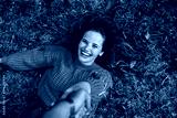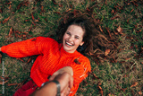 Top view of a gorgeous young woman smiling broadly in orange knitted sweater lying on the grass with autumn leaves and taking the hand to follow. The beautiful female has a joyful expression outdoors.