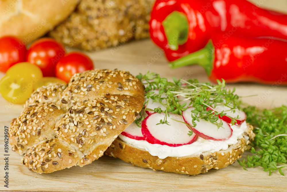Simple vegetarian sandwich - cream cheese, radishes and watercress on a wholegrain bun