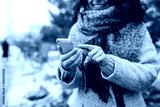 Young woman using her mobile phone at a snowy winter park. Closeup of female checking news and texting on her cellphone outdoor during cold winter season. Peoples' gadgets concept.