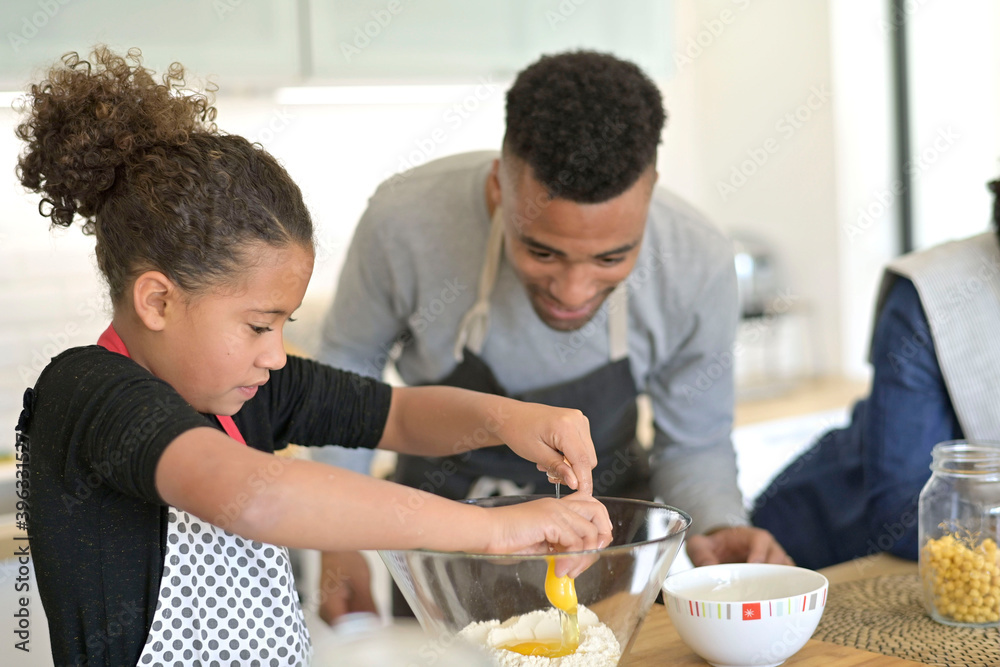 Happy family in home kitchen making homestyle american cookies