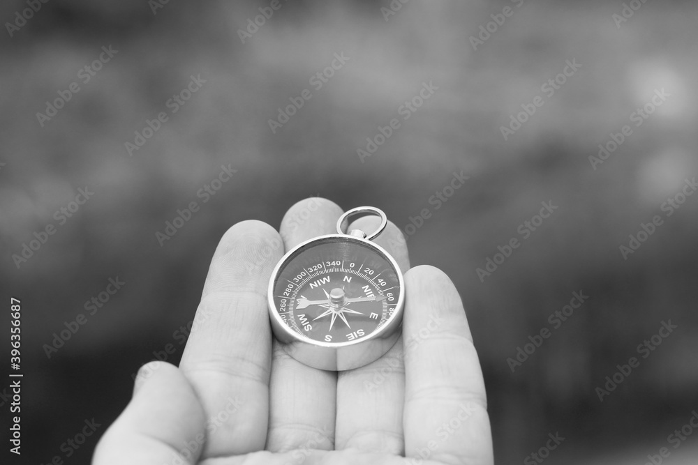 Classic navigation compass in hand on smoke background as symbol of tourism with compass, travel with compass and outdoor activities with compass