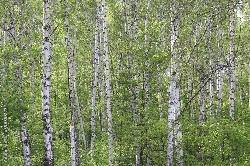 Young birch with black and white birch bark in spring in birch grove against the background of other birches