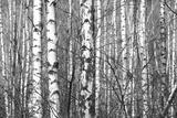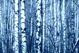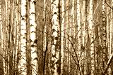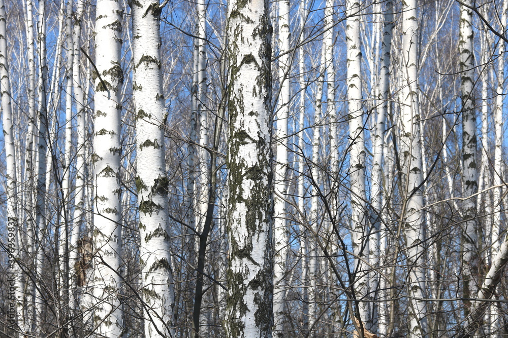 Young birches with black and white birch bark in spring in birch grove against background of other birches