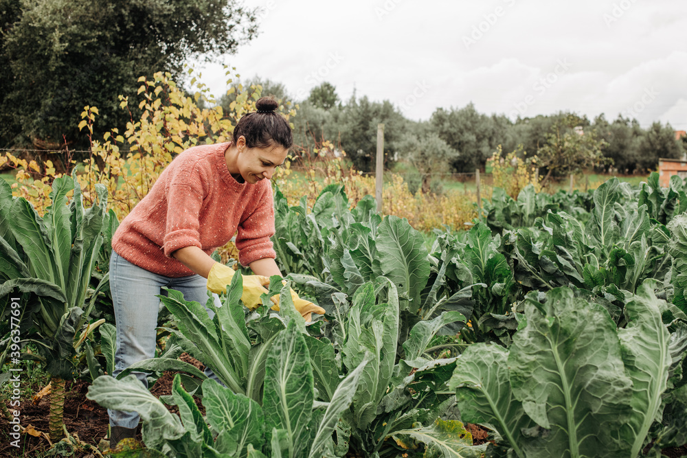 Woman wearing jeans, sweater and rubber gloves cultivating cabbage. Female farmer working in vegetable garden taking care of plants