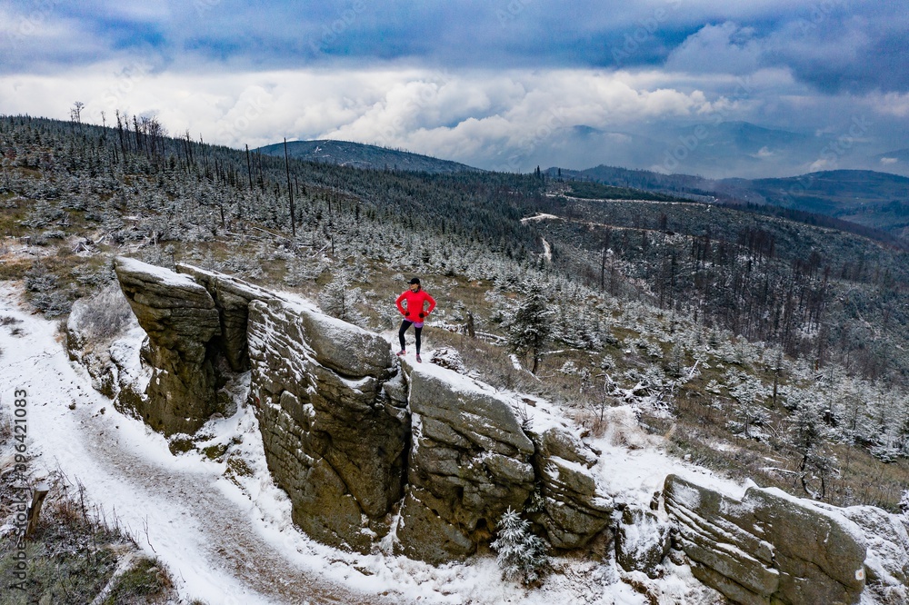Drone view on a athletic fit woman admires the beautiful winter mountain landscape while standing on the rock.