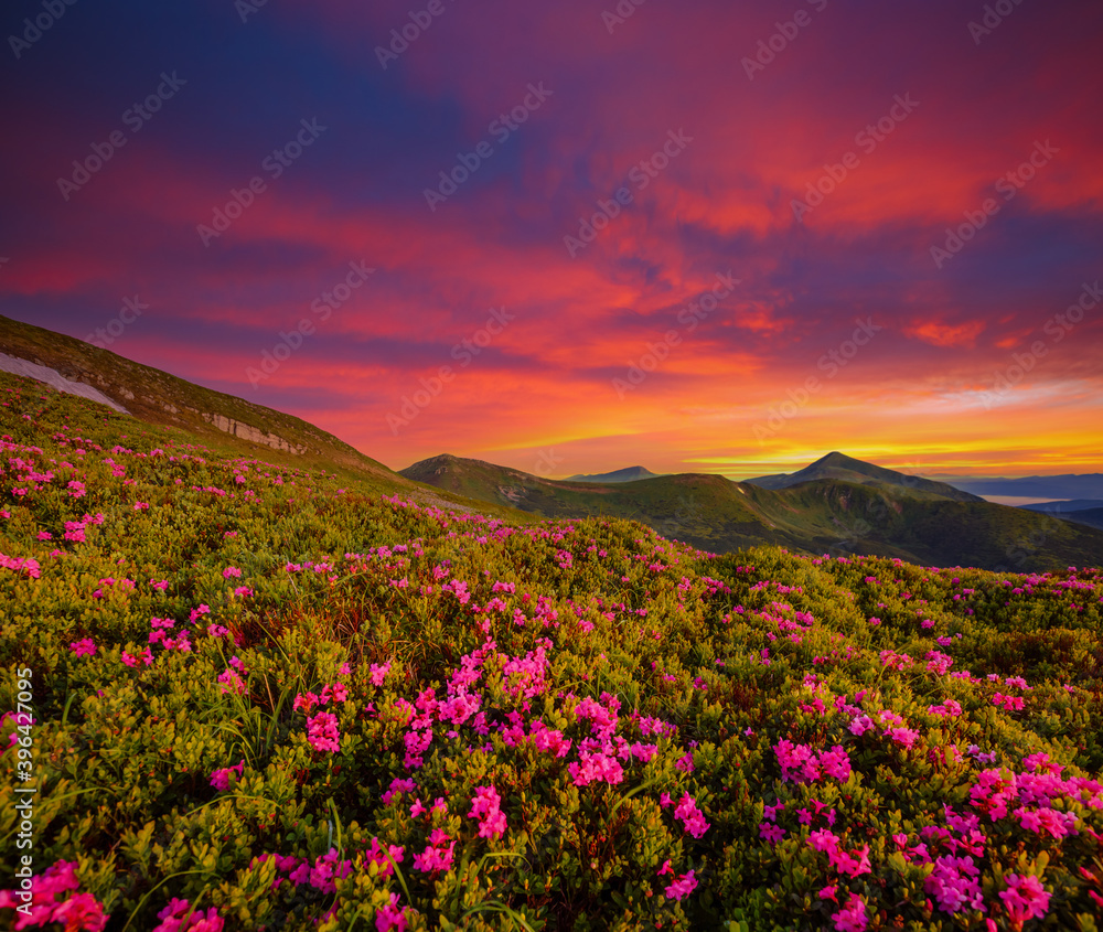 Summer scene with flowering hills illuminated by the sunset.