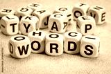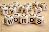 words - word abstract in wooden letter cubes against textured paper, language and communication concept