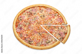 Photo of Italian pizza with mushrooms for use in advertising pizzeria, restaurant menu. Copy space for promo text.