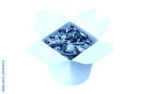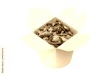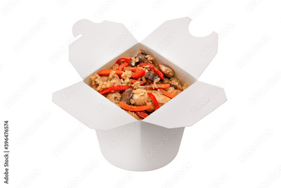 Asian fast food concept. Opened box of rice with chicken and vegetables cooked in a wok, isolated.