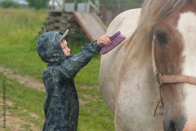 Horse and child in the field, the boy prepares the horse for the trip, clean the skin of his horse from litter and dandruff.