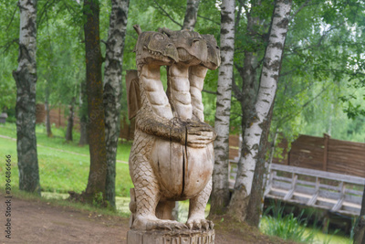 Wooden figure of a Gorynych snake from Russian fairy tales.