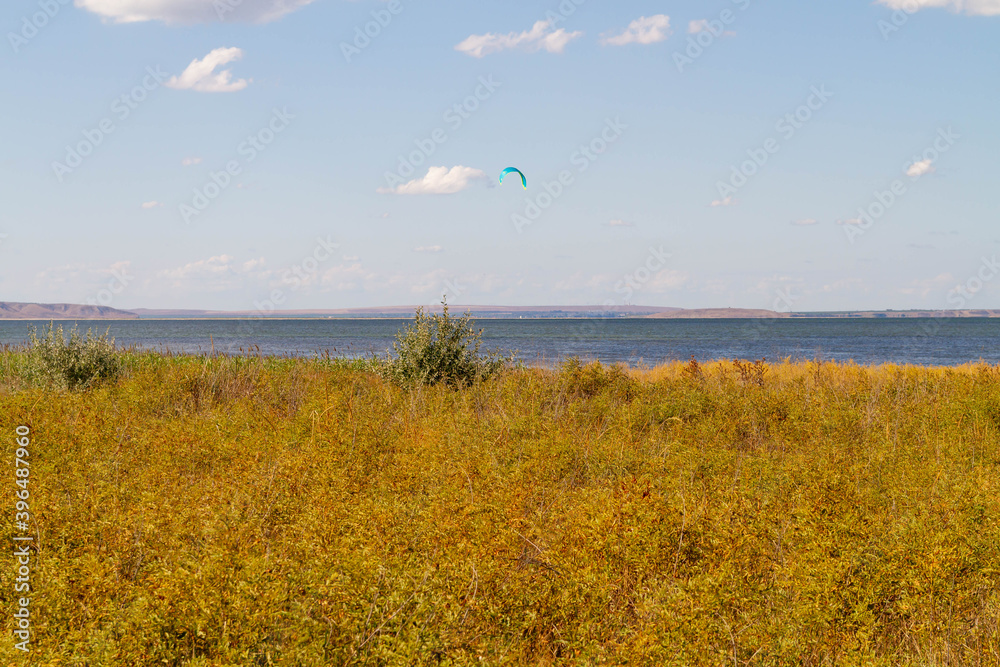 Yellowed grass in the steppe on the lake shore. Dried vegetation in hot climates.